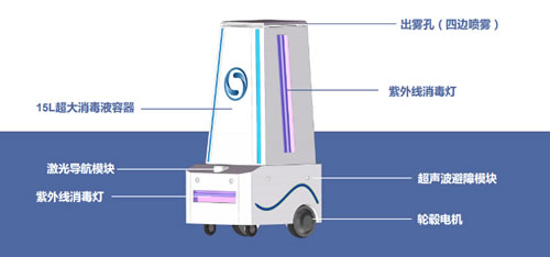 安森智能:ACRS 消毒殺菌機(jī)器人所在地:西安特點(diǎn):自動(dòng)駕駛?cè)轿幌麣�,手�?dòng)遙控消殺 ,消殺面積6000平方米/小時(shí),紅外人體測(cè)溫 ,智能識(shí)別佩戴口罩,智能避障 ![]() 鈦米機(jī)器人:鈦米消毒機(jī)器人所在地:上海特點(diǎn):輪式移動(dòng)機(jī)器人,能識(shí)別環(huán)境內(nèi)的物 品,實(shí)現(xiàn)自主避障;集成了包括過氧化 氫、次氯酸、紫外線燈等多種消毒手 段,配備消毒管理軟件,自動(dòng)根據(jù)空間 面積計(jì)算消毒時(shí)間。 ![]() 蘇京智能:智能消毒機(jī)器人所在地:南京特點(diǎn):智能消毒機(jī)器人同時(shí)采用消毒液體噴霧(超干霧84消毒水/超干霧過氧化氫)與紫外線燈,二臺(tái)一的消毒手段,解決不同場(chǎng)所下的多元化消毒需求,干濕可選,雙管齊下,最大化解秘情當(dāng)前各公共場(chǎng)所的消毒需求。 ![]() YOGO R0 BOT:YOGO噴霧消殺機(jī)器人所在地:深圳特點(diǎn):輪式移動(dòng)機(jī)器人,機(jī)器人頂部裝有噴霧 裝置,可以根據(jù)預(yù)先規(guī)劃的消毒路徑自 動(dòng)消毒,并可以通過智能loT設(shè)備與整 個(gè)樓宇形成物聯(lián)網(wǎng)系統(tǒng)。 ![]() 東富龍:智能滅菌機(jī)器人所在地:上海特點(diǎn):輪式移動(dòng)機(jī)器人,采用過氧化氫蒸汽滅 菌。通過電腦WIFI遠(yuǎn)程控制,根據(jù)滅菌需求,設(shè)置房間滅菌順序,自主規(guī)劃路 徑并規(guī)避障礙,連續(xù)工作時(shí)間能達(dá)5小時(shí)。 ![]() 小笨智能:智能超干霧化機(jī)器人所在地:北京特點(diǎn):機(jī)器人裝有自主導(dǎo)航避障底盤,可以自主靈活規(guī)劃消毒路徑,自動(dòng)消毒、保存工作記錄,將工作數(shù)據(jù)通過頭上的屏幕反饋給人工。最終實(shí)現(xiàn)人機(jī)分離,減少人員接觸有效降低感染風(fēng)險(xiǎn)。 ![]() 優(yōu)艾智合:優(yōu)艾智合消毒機(jī)器人所在地:深圳特點(diǎn):輪式移動(dòng)機(jī)器人,移動(dòng)平臺(tái)上配備紫外 線消殺管,可實(shí)現(xiàn)無人值守,遠(yuǎn)程遙控。 ![]() 朗馳欣創(chuàng):LC-GR2001全自動(dòng)消毒機(jī)器人所在地:深圳特點(diǎn):四輪驅(qū)動(dòng)型移動(dòng)機(jī)器人,在機(jī)器人上配 備噴灑裝置,全自主運(yùn)行,行走過程中 可完成方圓3米內(nèi)噴灑消毒。 ![]() 悟牛智能:悟牛智能消毒機(jī)器人所在地:青島特點(diǎn):仿人型輪式機(jī)器人,在機(jī)器人背部加裝自動(dòng)噴灑裝置,實(shí)現(xiàn)對(duì)工作區(qū)域的自動(dòng) 消毒。 ![]()