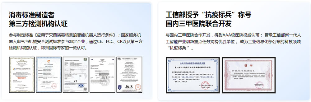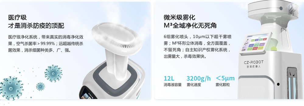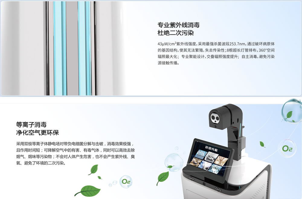 智能消毒滅菌機器人V5功能自主導(dǎo)航∶ 自動按照規(guī)劃路徑進行消毒任務(wù) 定時命令∶無需人工干預(yù), 定時執(zhí)行消毒任務(wù) 消毒效率高∶ 消毒空間可達到≥1000m2/h,滅菌率可達到>99.99% 雙重消毒模式∶過氧化氫霧化消毒+紫外線燈消毒 人身保護∶具備人體感應(yīng)裝置, 行人靠近時停止消毒 實時監(jiān)控∶可實時監(jiān)控機器人運行狀態(tài) 霧化顆粒小∶ 霧化顆�!�10μm 消毒全面∶360°無死角全方位消毒,可根據(jù)場景要求控制霧量